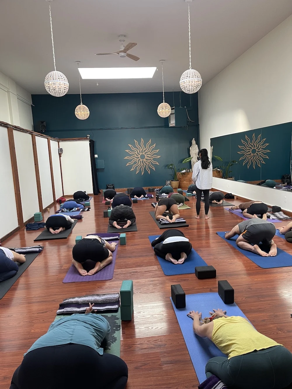 Each day has a consistent rhythm and schedule, starting with meditation, breathing, chanting, and moving into a more physical practice with a breakdown of methods experienced, followed by lunch and an afternoon of asana, anatomy, and teaching skills/ practice teaching. The day ends with a guided meditation.  Breaks are given throughout the day.